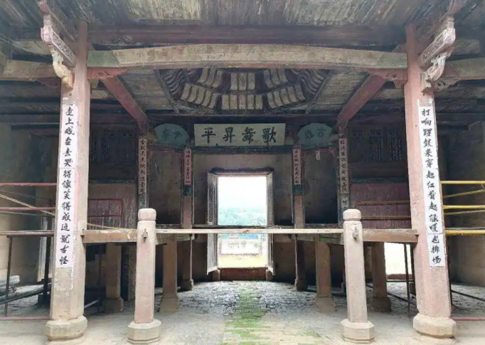 礼乐空间: 入门即见古戏台(下厅),藻井彩绘依稀可辨;两侧走马楼曾满座观戏族人。