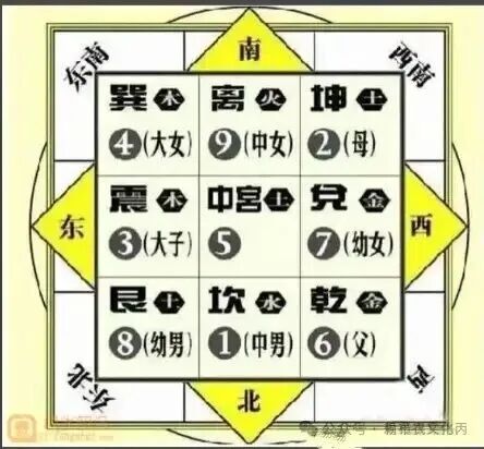 这种规律不知源于何种易理,但将其放入先天图配洛书后会有如下发现