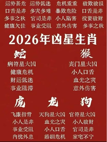 在传统干支纪年与地支相冲相害的理论体系中,2026丙午年的值年太岁为“午”。因此,与“午”产生特定关系的生肖,即为“犯太岁”,主要包括: