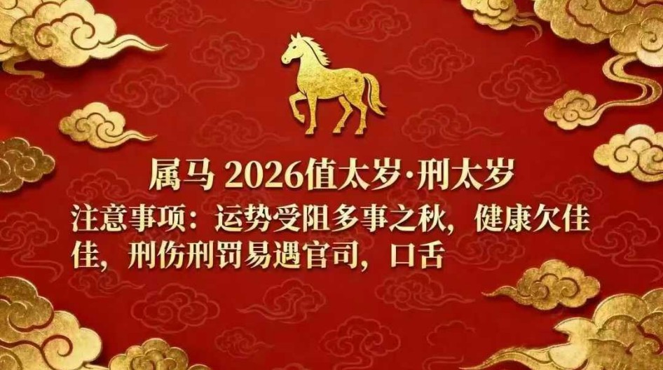 午午自刑,因此生肖马在值太岁之外也叠加了刑太岁的影响。“刑”有自我折磨、内部矛盾、法律文书纠葛之意。属马者今年需防范内在情绪困扰、自我纠结以及官非。