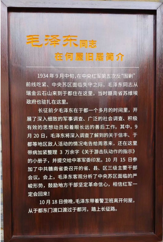 同年9月,毛泽东从瑞金抵达于都,入住何屋东侧横屋,虽身患重病仍日夜操劳。